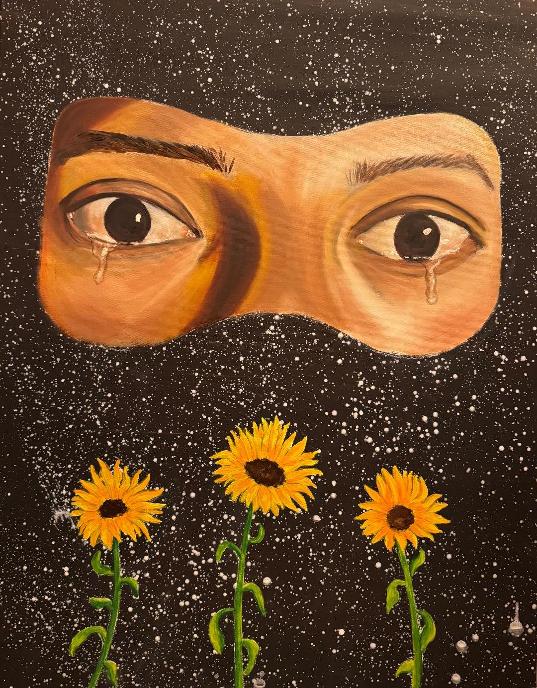 Artist paints her eyes for the first time. Eyes are the windows of the soul and as she cries her pain away, she transforms it into power, creating blooming sunflowers into her universe.